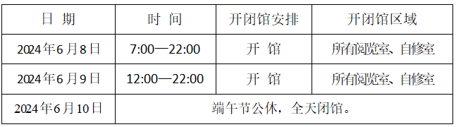 根据国家及我校2024年端午节放假的有关安排,结合图书馆的实际情况,6月8日至6月10日端午节假期期间图书馆开馆时间具体安排如下: