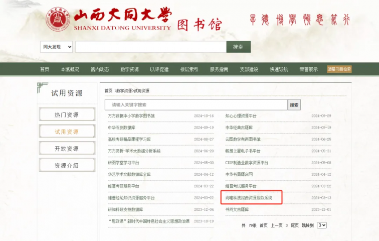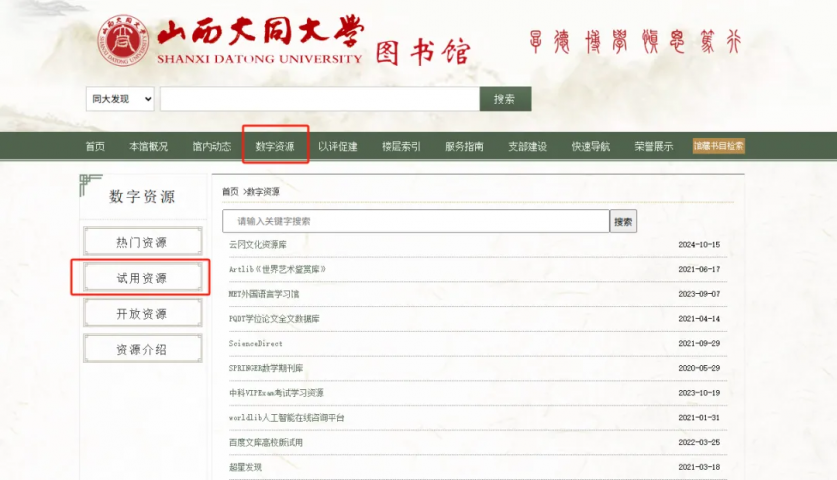 1、在校园IP范围内,登录山西大同大学图书馆官网,点击上方导览“数字资源-试用资源”。